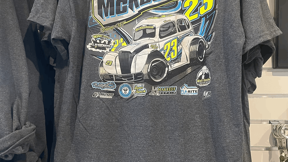 Show your support for Stu McKechnie and his #23 Legend race car with these extra comfy hoodies! These are grey in color and have his name and number on the front and the car and sponsors on the back. The tshirt photo shows the back design. Very limited quantities so get yours now!